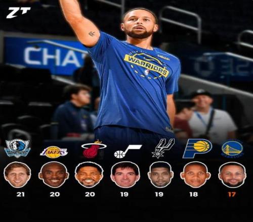 斯蒂芬-库里即将迎来为勇士队效力的第17个赛季,他也将成为NBA历史上第七位,为单一球队效力超过17年的球员。NB...