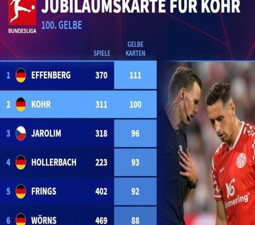 • 黄卡大师,美因茨后卫科尔是德甲历史上唯二染黄破百的球员