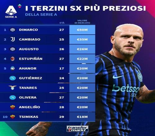 北京时间10月13日,德国转会市场发布了意甲联赛左后卫球员最新身价榜单,国米球星迪马尔科5000万欧元居首,坎比亚索、奥古斯托分列二三。