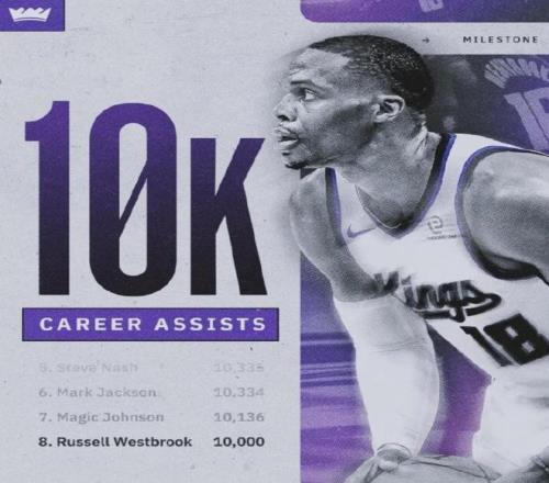 在比赛的第三节,威少爷送出了个人本场第7次助攻,至此他的NBA生涯总助攻数突破了10000次,升上NBA历史助攻榜第8位。